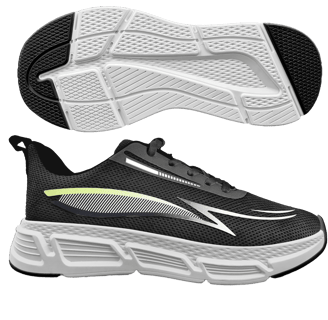 BLACK UPPER WITH neon green accent and off-white midsole, black outsole.